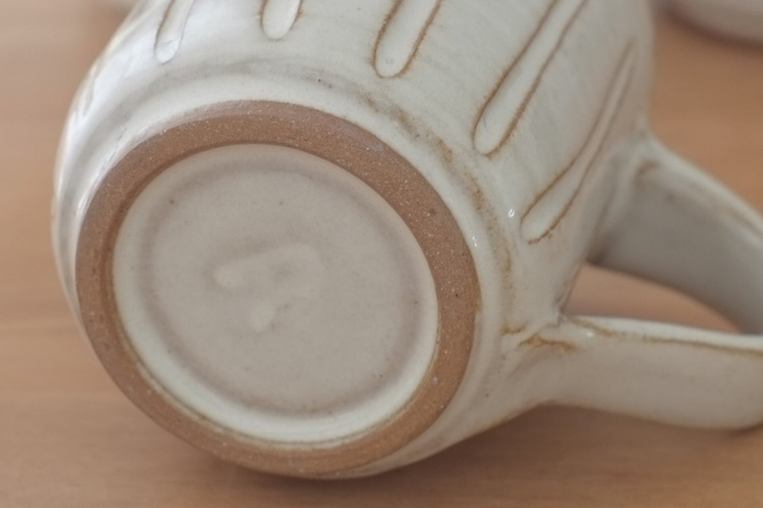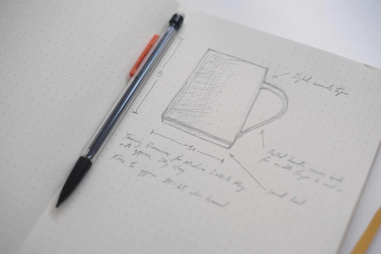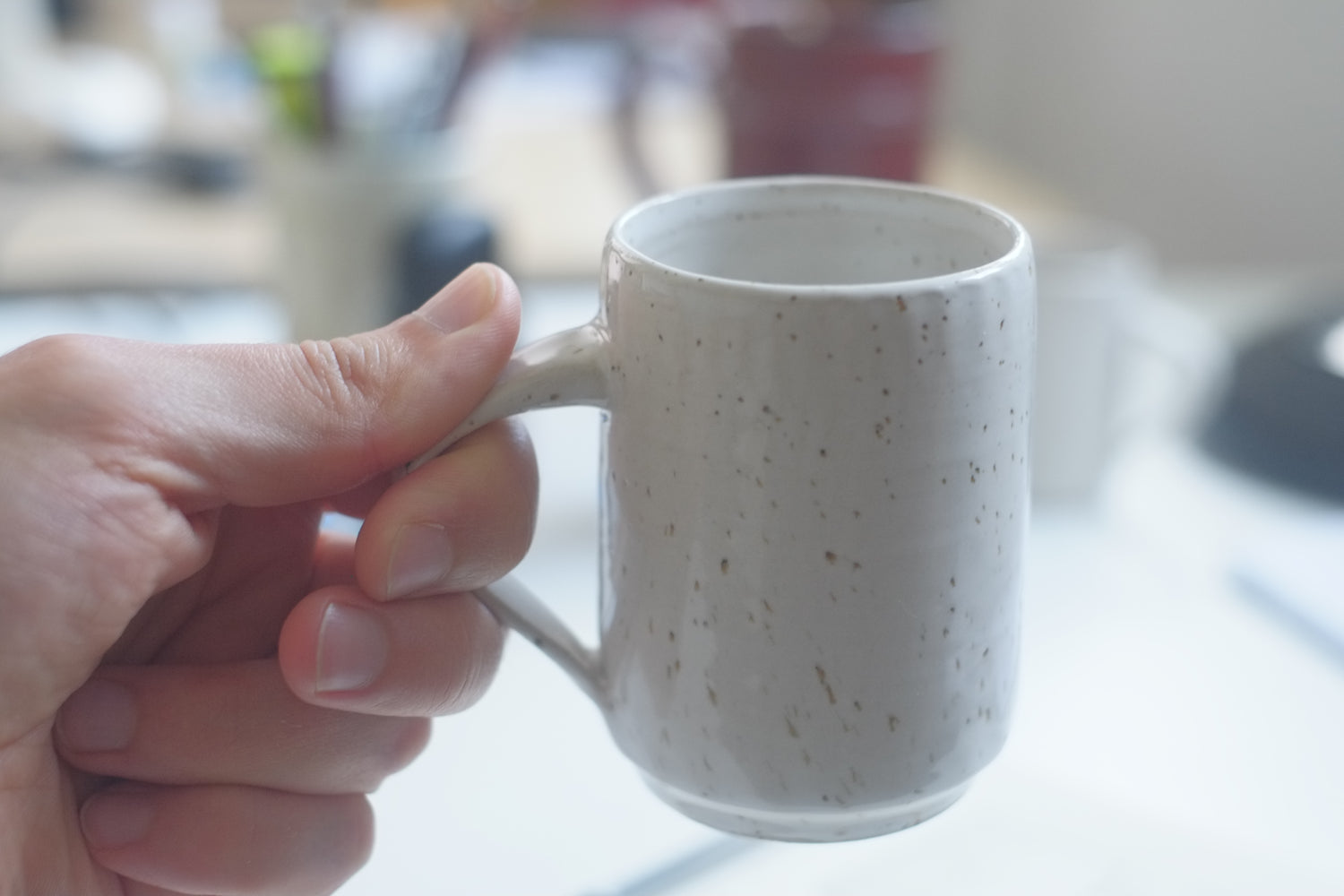 Mug bodies are thrown taller than they are wide. This is partly for aesthetics, but also makes it harder for liquid to slosh out, compared with a low, wide vessel (still great for the classic flat white!). A small foot keeps the mug bottom elevated and reduces the amount of heat or condensation transferred when placed on a table. Walls are trimmed thin to reduce weight, but not so thin to be delicate.